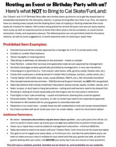 - Click HERE or on the thumbnail below for a viewable and printable .PDF version of the prohibited items you can not bring inside Cal Skate/FunLand for Classic and V.I.P. parties.