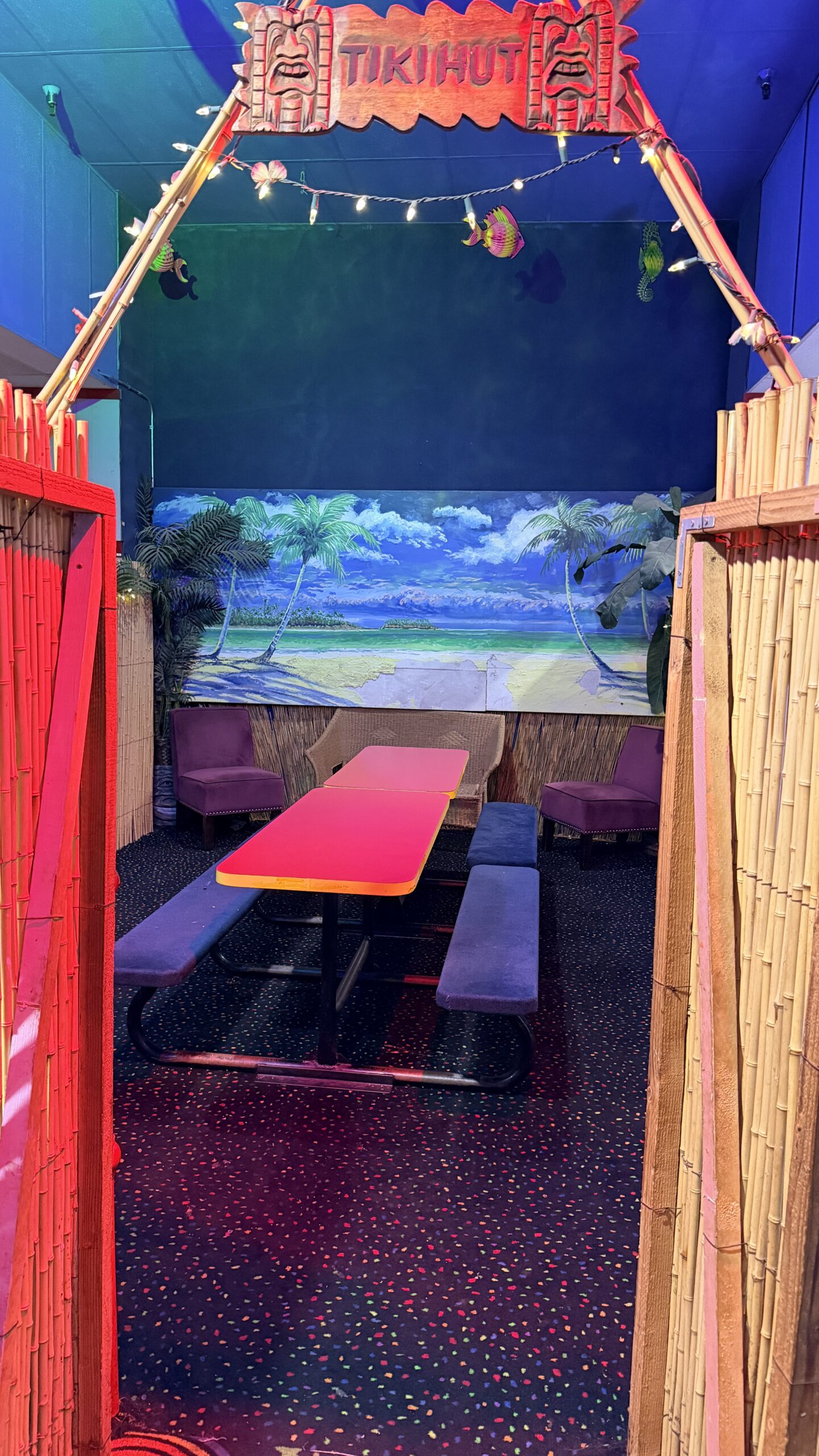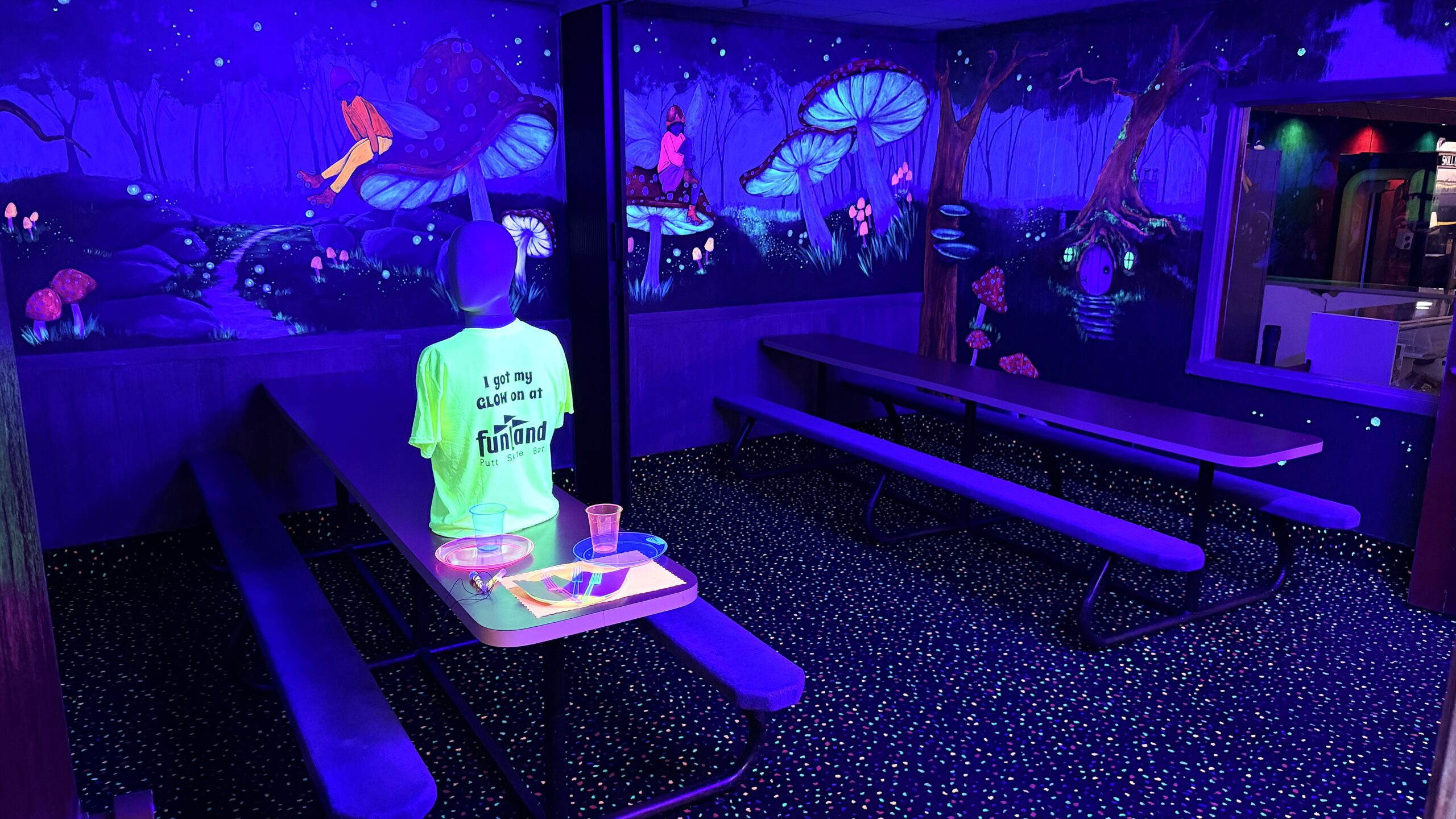 The Glow Party package turns a great 'Classic Party' room into an amazing one! Black lights, glow t-shirt for the birthday person, glow sticks for the guests, 'popping' neon-reactive tableware, plus more! (Not available for the private 'V.I.P.' parties or in the Tiki Room).