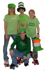 We haven't done thisĀ Cheapskate Night theme, in a while at least. St. Patrick's Day lands on a Tuesday again this year so it's time to get your GREEN ON! We're going to have a totally GREEN night from 6:30-8:30pm and we'll be rewarding those that wear the most green! We'll throw in a few Irish St. Patrick's tunes, but the majority of the night will be fun music - songs with GREEN somehow in the lyrics or title. Win prizes if you can guess the music trivia questions correctly! Those that do deck themselves out with tons of GREEN will be entered in our costume contest! The session goes from 6:30-8:30pm and costs ONLY $9.50 - that also includes your quad skate rentals! Like all Cheapskate Nights, it will be family-focused fun - music and games. We'll still throw in a few new hits, but we'll be sure to play the best music from Ireland and the GREEN ones for sure. "What's the craic?" ("What's the fun" in English!)